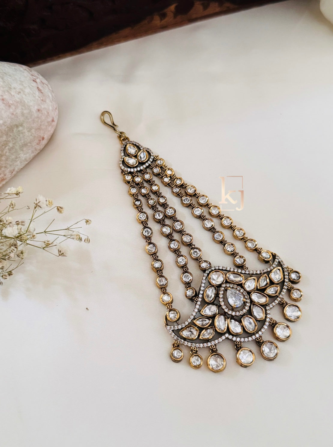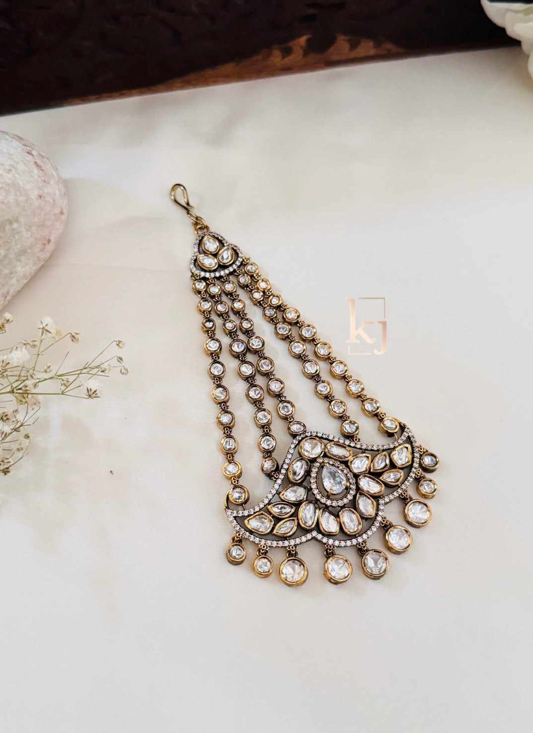 This Alice White Pearls Is Handcrafted In Brass Alloy With Imitation Zircon & Gold Polki Work Of Very Fine Quality . This Matha Patti Is Coated With 18 Kt Gold Polish Which Give It A Real Look . An Absolutely Stunning Piece To Own And Is Very Light In Weight.**All Jewelry Is Completely Inspected For Every Crystal And Bead Before We Send It Out,Each Piece Is Carefully Packaged To Reach You Safely. And Comes In A Box.*