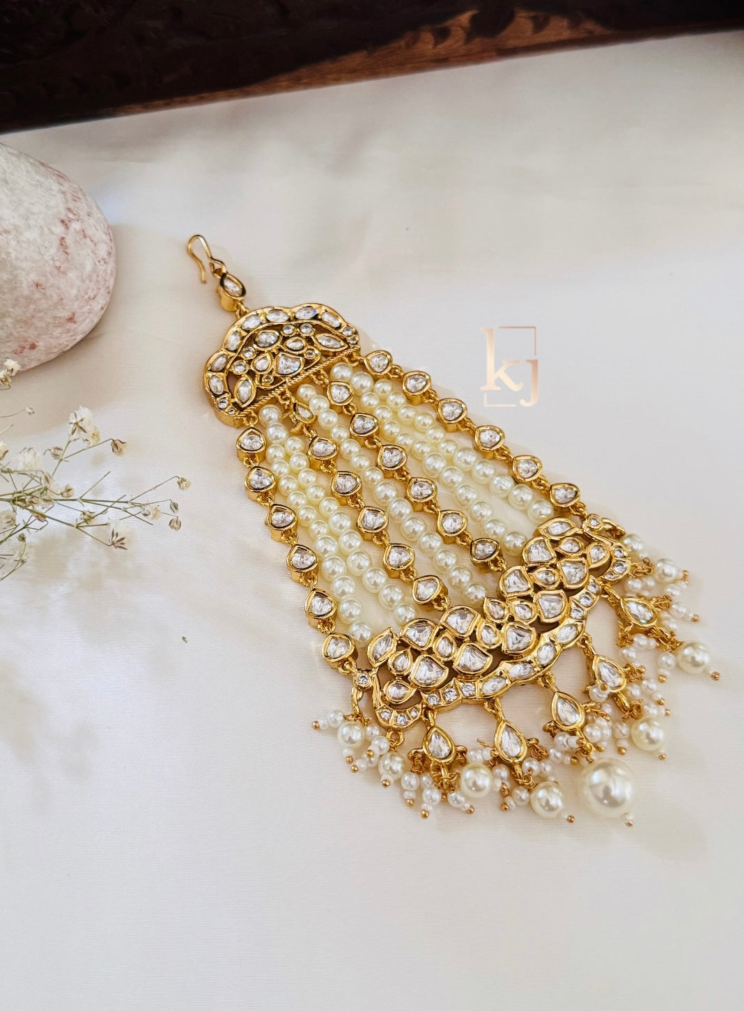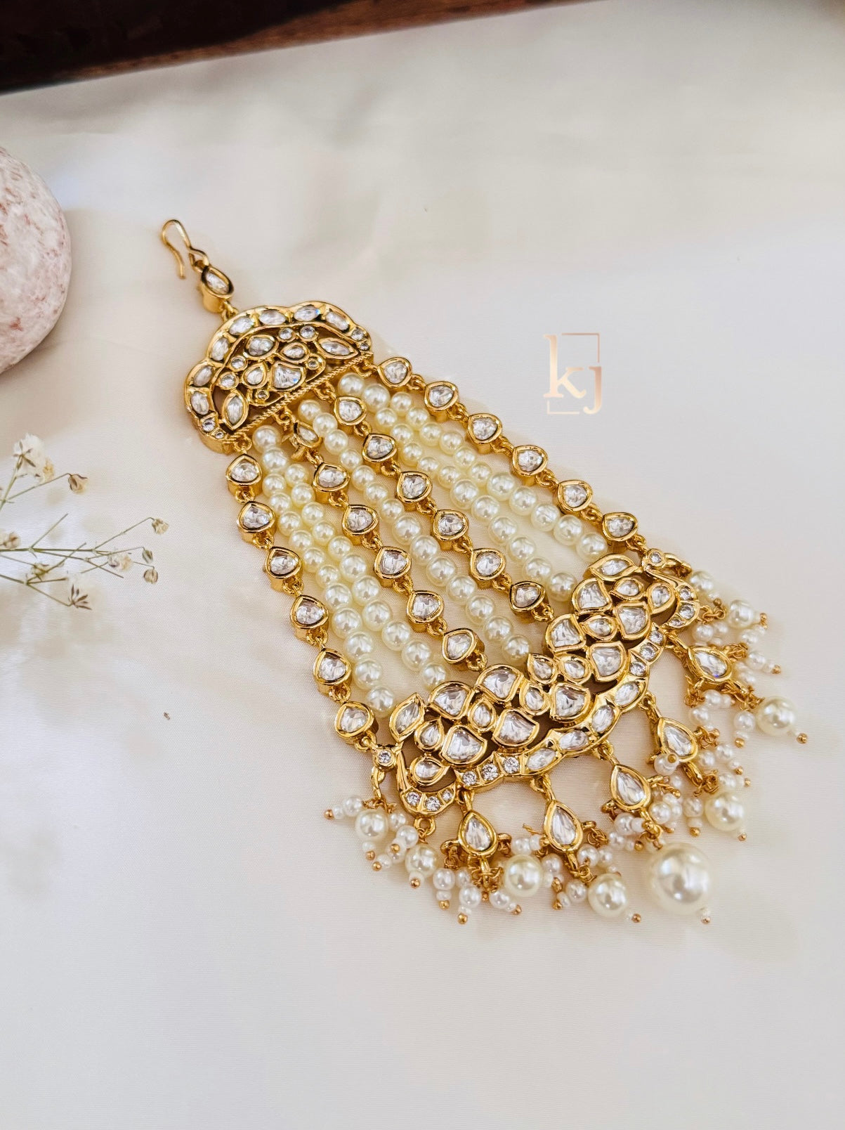This Alice White Pearls Is Handcrafted In Brass Alloy With Imitation Zircon & Gold Polki Work Of Very Fine Quality . This Matha Patti Is Coated With 18 Kt Gold Polish Which Give It A Real Look . An Absolutely Stunning Piece To Own And Is Very Light In Weight.**All Jewelry Is Completely Inspected For Every Crystal And Bead Before We Send It Out,Each Piece Is Carefully Packaged To Reach You Safely. And Comes In A Box.*