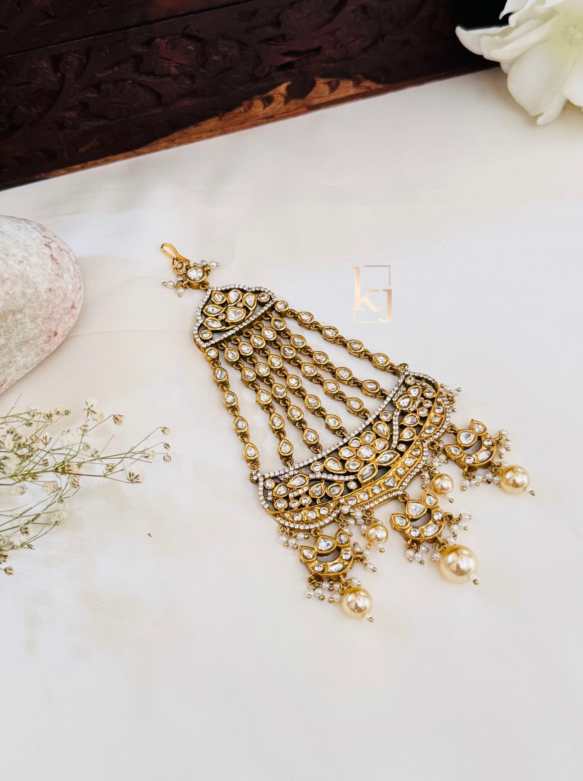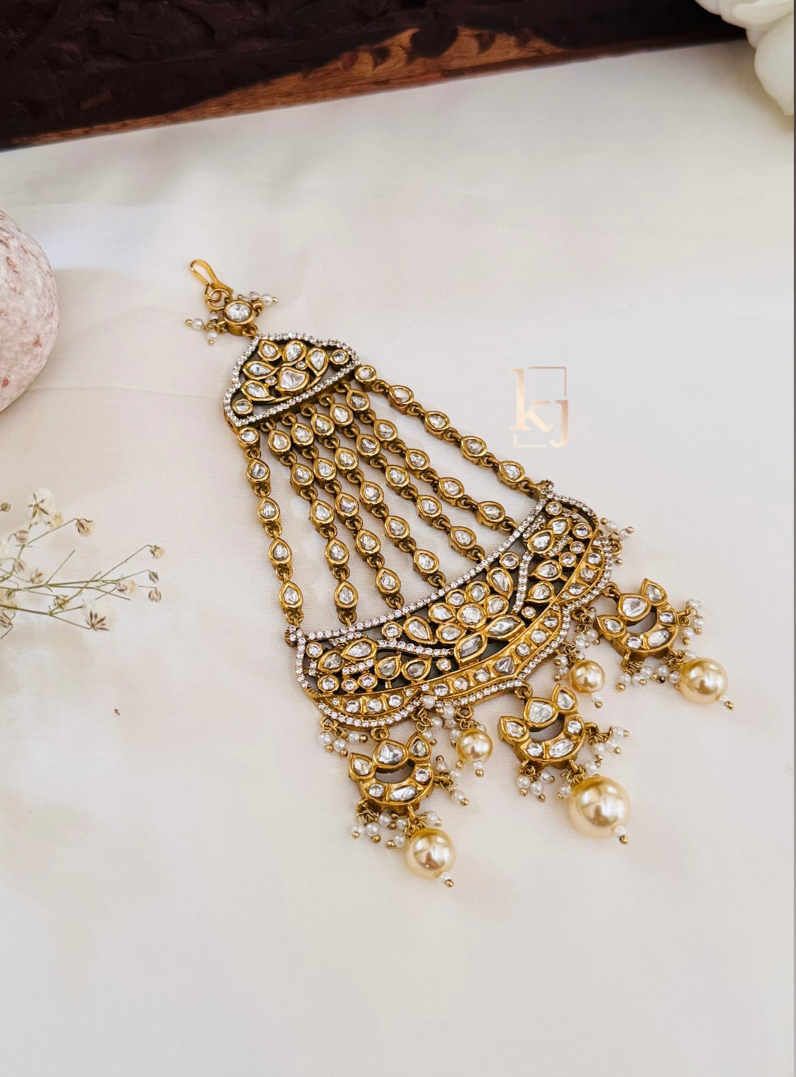 This Alice White Pearls Is Handcrafted In Brass Alloy With Imitation Zircon & Gold Polki Work Of Very Fine Quality . This Matha Patti Is Coated With 18 Kt Gold Polish Which Give It A Real Look . An Absolutely Stunning Piece To Own And Is Very Light In Weight.**All Jewelry Is Completely Inspected For Every Crystal And Bead Before We Send It Out,Each Piece Is Carefully Packaged To Reach You Safely. And Comes In A Box.*
