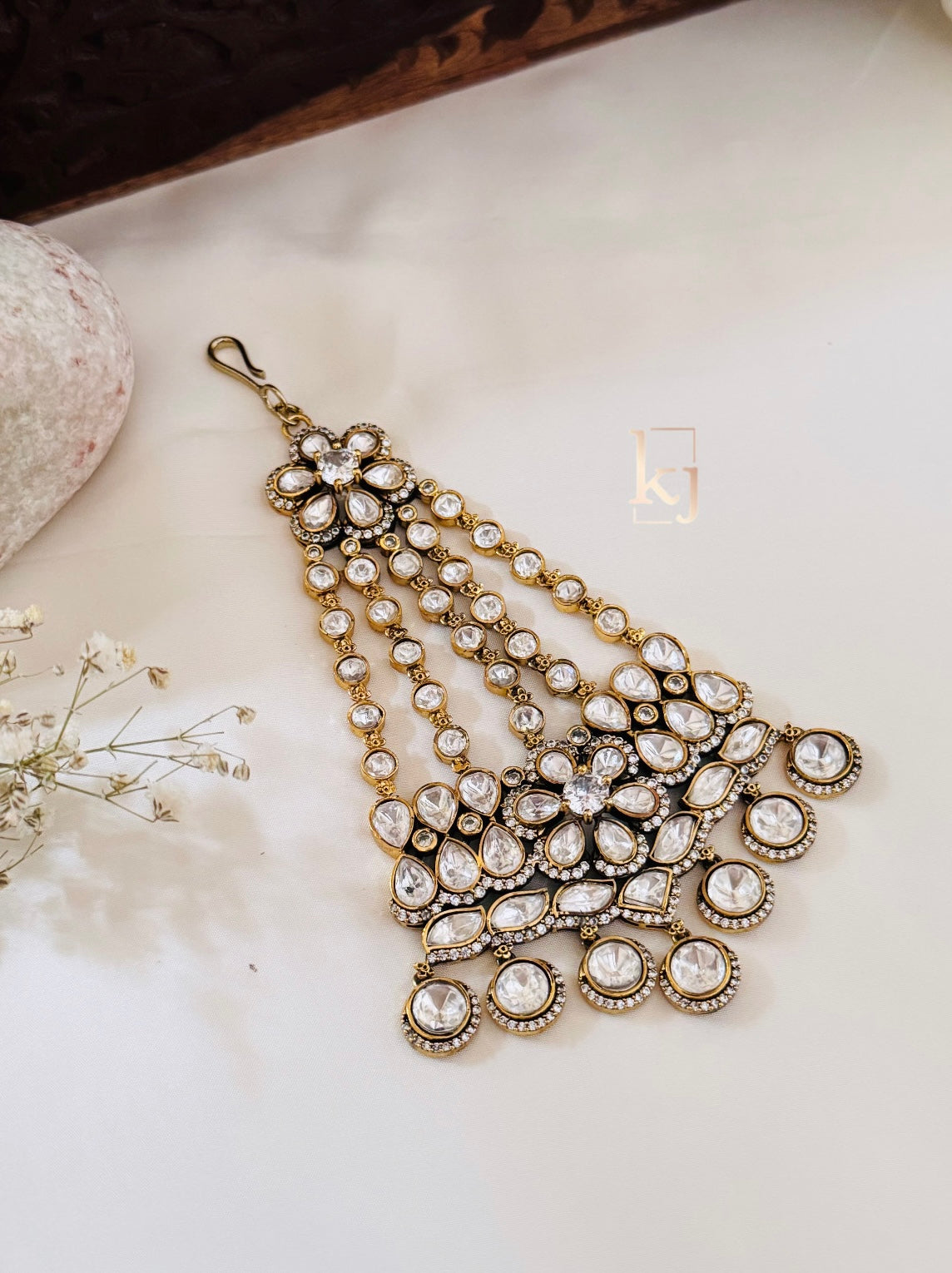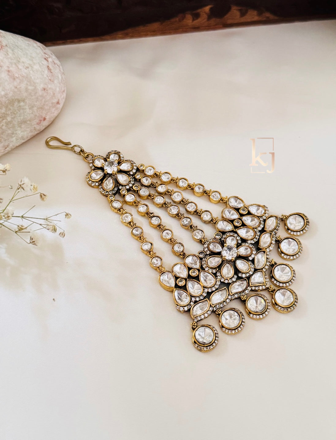 This Alice White Pearls Is Handcrafted In Brass Alloy With Imitation Zircon & Gold Polki Work Of Very Fine Quality . This Matha Patti Is Coated With 18 Kt Gold Polish Which Give It A Real Look . An Absolutely Stunning Piece To Own And Is Very Light In Weight.**All Jewelry Is Completely Inspected For Every Crystal And Bead Before We Send It Out,Each Piece Is Carefully Packaged To Reach You Safely. And Comes In A Box.*