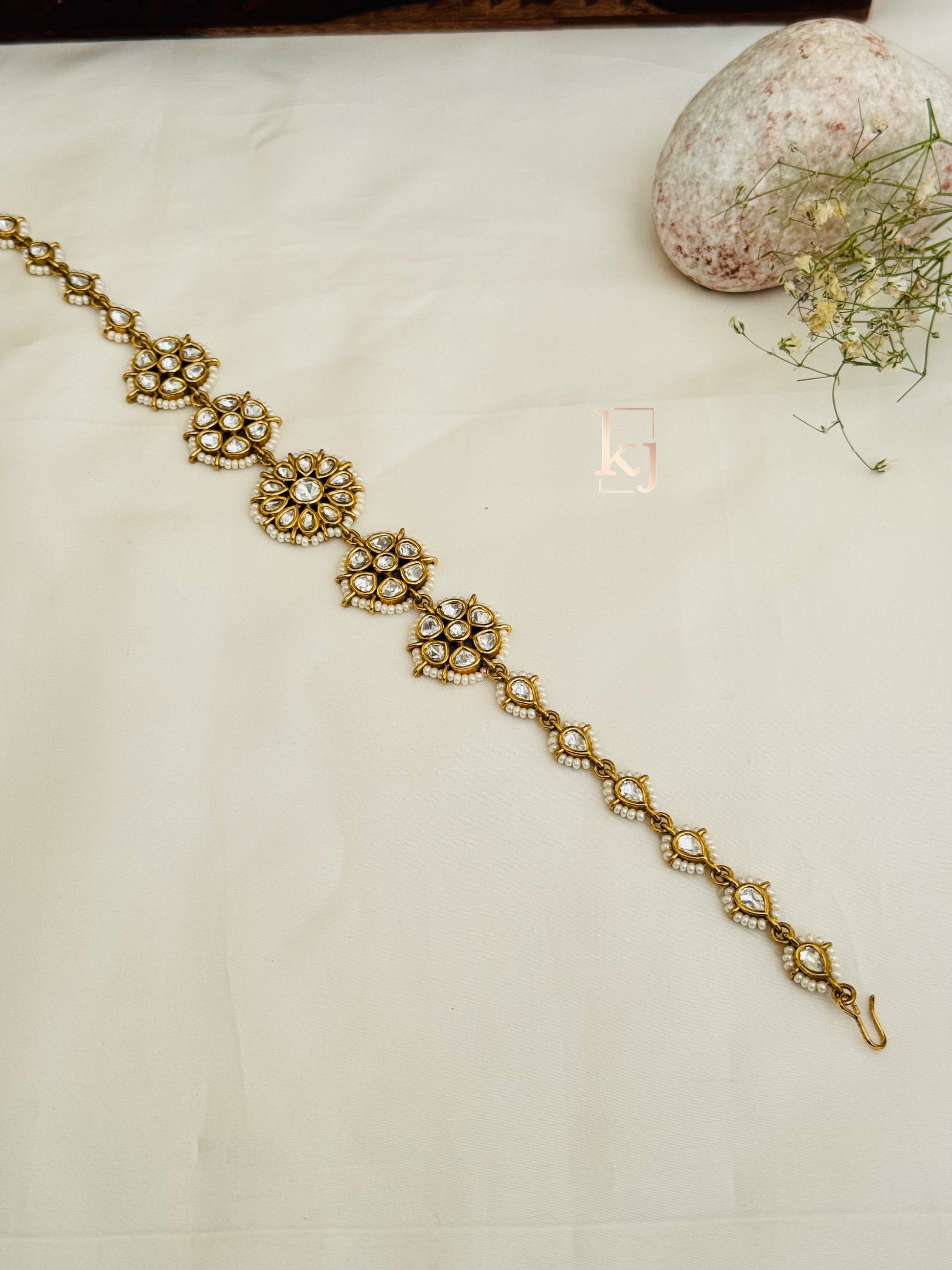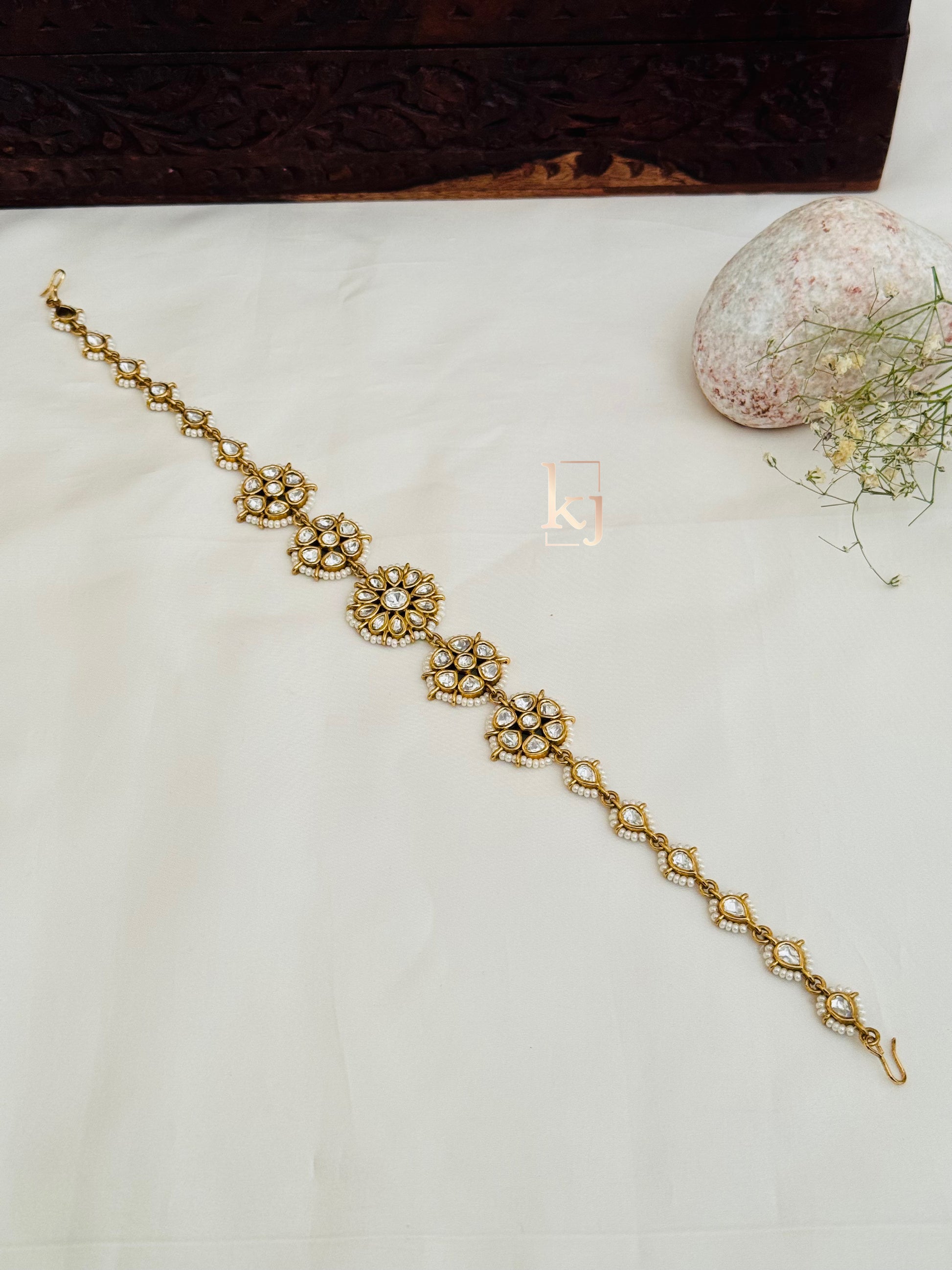 This Aksha Is Handcrafted In Brass Alloy With Imitation Zircon & Gold Polki Work Of Very Fine Quality . This Matha Patti Is Coated With 18 Kt Gold Polish Which Give It A Real Look . An Absolutely Stunning Piece To Own And Is Very Light In Weight.**All Jewelry Is Completely Inspected For Every Crystal And Bead Before We Send It Out,Each Piece Is Carefully Packaged To Reach You Safely. And Comes In A Box.*
